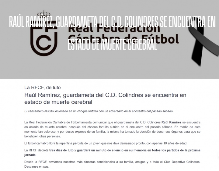 坎塔布里亚足球界也无法掩饰对这位英年早逝的年轻人的哀痛,他们悼念的不仅是一个门将,更是一个未来的希望。皇家足球协会宣布为他举行为期三天的哀悼,并在下轮比赛中默哀一分钟,仿佛是要通过这一方式告诉大家:生命如此脆弱,何以为家?向劳尔-拉米雷斯的家人和他的俱乐部表示诚挚的慰问,愿他在另一世界找到安宁。