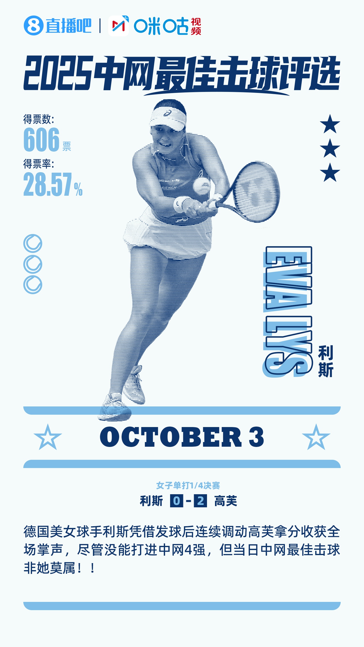在10月3日的投票中,利斯的发球连续调动高芙与对手的接发,最终以28.57%的支持率获得当天的“中网最佳击球”称号。这样的发球展示了利斯出色的发球技术与战术意识,是比赛中的一大亮点。