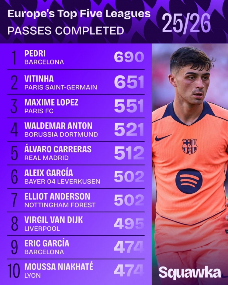 10月17日,Squawka发布了本赛季至今欧洲五大联赛球员的传球次数排名。巴萨的中场球员佩德里以690次传球位居榜首,而巴黎圣日耳曼的维蒂尼亚则以651次紧随其后。