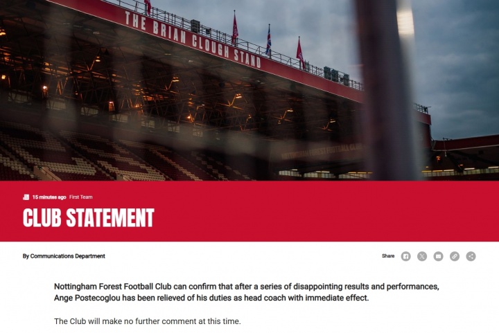 诺丁汉森林足球俱乐部日前正式发布公告,宣布由于近期战绩不佳以及球队表现的持续低迷,主教练安吉·波斯特科格鲁已被立即解除职务。这一决定是在经过深思熟虑后作出的,俱乐部希望能通过这一举措重新振兴球队,迎来新的局面。