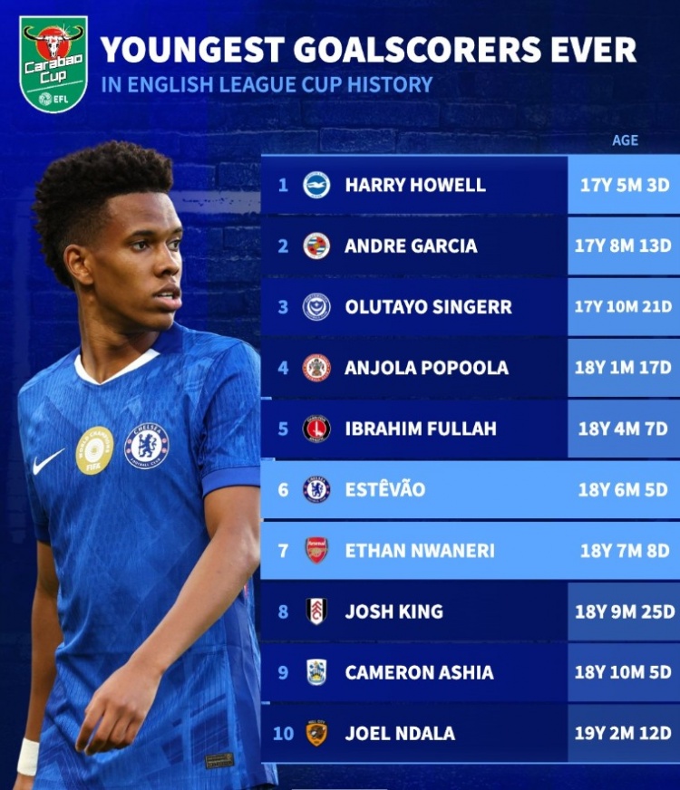 埃斯特旺和恩瓦内里以18岁高龄在联赛杯历史最年轻进球榜上位列第六和第七_英超直播