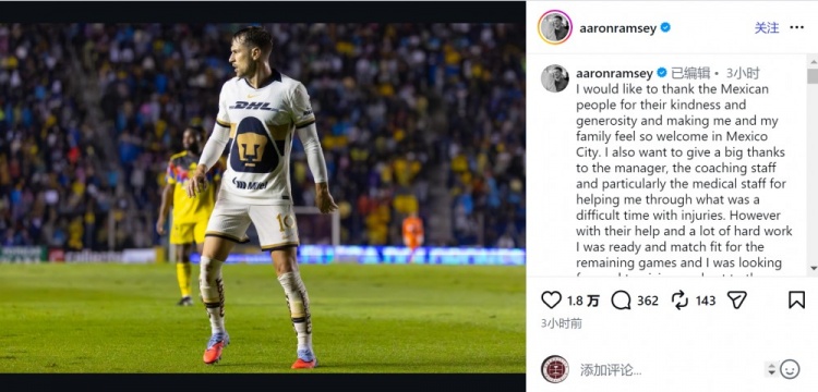 拉姆塞最近在社交媒体上更新了动态,向墨西哥的球迷们表达了告别之情。随着他与墨西哥美洲狮俱乐部的解约,拉姆塞在动态中写到:“我真心感谢墨西哥人民的温暖和慷慨,这里的氛围让我和我的家人感受到了无比的热情。在墨西哥城度过的时光,我们倍感珍惜。”